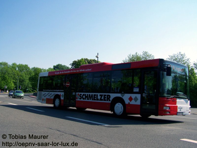 Diese Aufnahme des SB-RV 141, einem MAN NÜ 313 der RSW, wäre eigentlich verschossen - doch die Werbung rettet dieses Foto. Der Wagen trägt bereits das neue SaarVV Regio-Design und hat nach der Umgestaltung auch wieder seine alte Werbung für Schmelzer Küchen erhalten. Abgelichtet habe ich den Wagen auf der R6 nach St. Ingbert in des Busparkplatzes "Spitzbunker", er kam gerade vom Hauptbahnhof. Die Matrix an der Seite funkiert bei den 140er Wagen nicht bei allen Zielen...