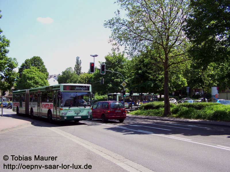 Ein alter Schatz, einer von noch 4 vorhandenen MAN SG 242: der Wagen 210 der NVG. Aufgenommen in der Lindenallee, unterwegs nach Illingen als E-Wagen im Schülerverkehr.