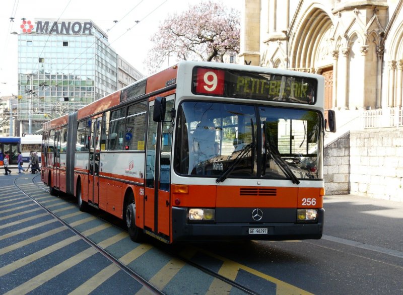TG Genf - Gelenkbus Mercedes O 405 G Nr.256 GE 96297 eingeteilt auf der Linie 9 unterwegs in Genf am 07.05.2008