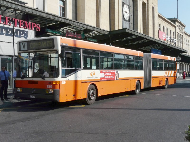 TG Genf - Gelenkbus Mercedes O 405 G Nr.289 GE 96077 eingeteilt auf der Linie V bei der Haltestelle vor dem Bahnhof in Genf am 07.05.2008