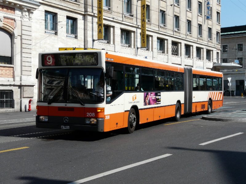 TG Genf - Gelenkbus Mercedes O 405 GN Nr.208 GE 96573 eingeteilt auf der Linie 9 unterwegs in Genf am 07.05.2008