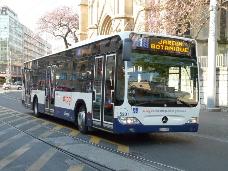 TG Genf - Mercedes Citaro Bus Nr.530 GE 960592 unterwegs auf der Linie 1 in Genf am 07.05.2008
