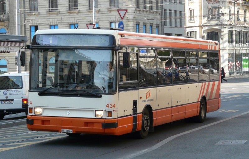 TG Genf - Renault Bus R 312 Nr.434 GE 96844 eingeteilt auf der Linie 1 unterwegs in Genf am 07.05.2008