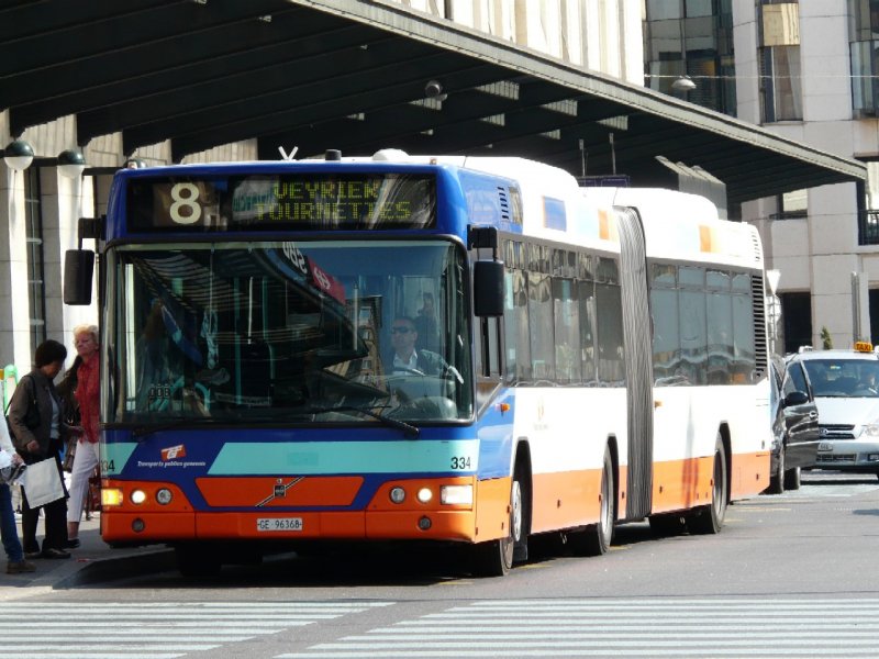 TG Genf - Volvo Gelenkbus Nr.337 GE 96368 bei der Haltestelle vor dem Bahnhof in Genf am 07.05.2008