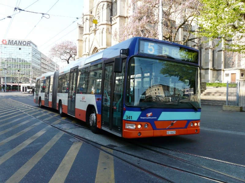TG Genf - Volvo Gelenkbus Nr.341 GE 96427 eingeteilt auf der Linie 5 unterwegs in Genf am 07.05.2008