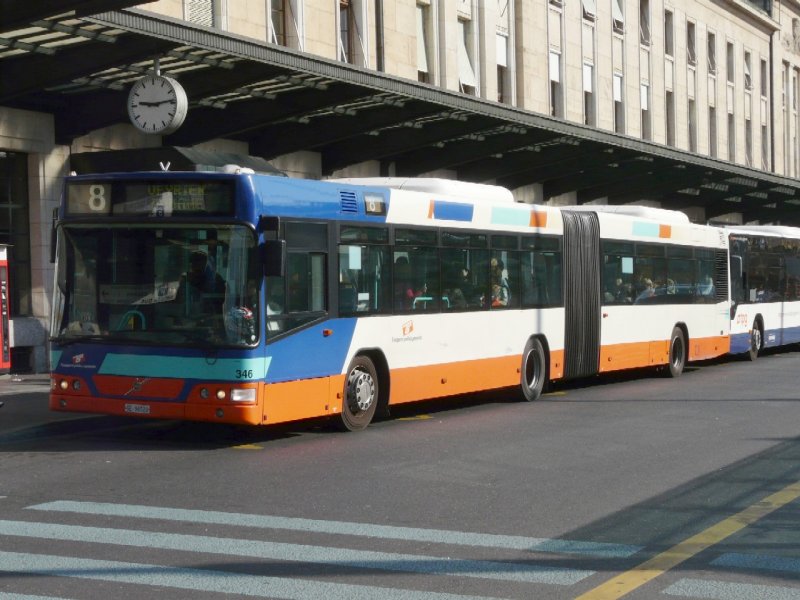 TG Genf - Volvo Gelenkbus Nr.346 GE 96520 bei der Haltestelle vor dem Bahnhof in Genf am 07.05.2008