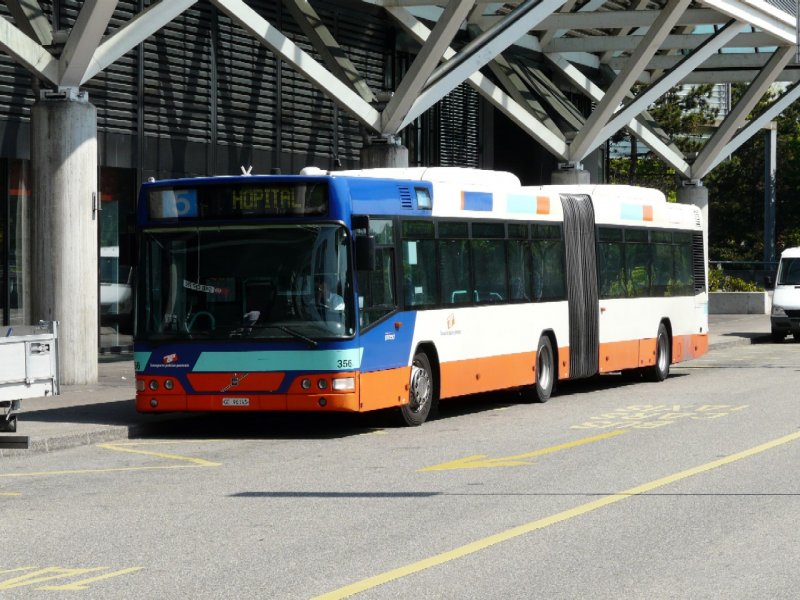 TG Genf - Volvo Gelenkbus Nr.356 GE 96145 bei der Haltestelle vor dem Flughafen Bahnhof in Genf am 07.05.2008
