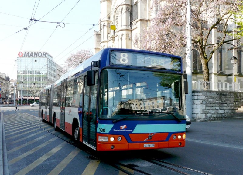 TG Genf - Volvo Gelenkbus Nr.380 GE 96458 eingeteilt auf der Linie 8 unterwegs in Genf am 07.05.2008