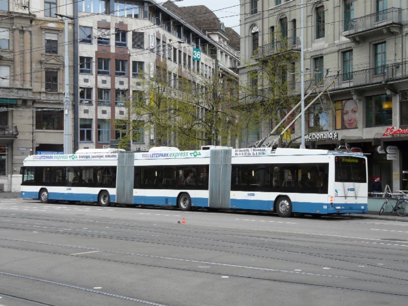 VBZ Zürich - 3 Teiliger Hess - Swisstrolley BGGT-N2C Nr.68 unterwegs auf der Linie 31 am 19.04.2008