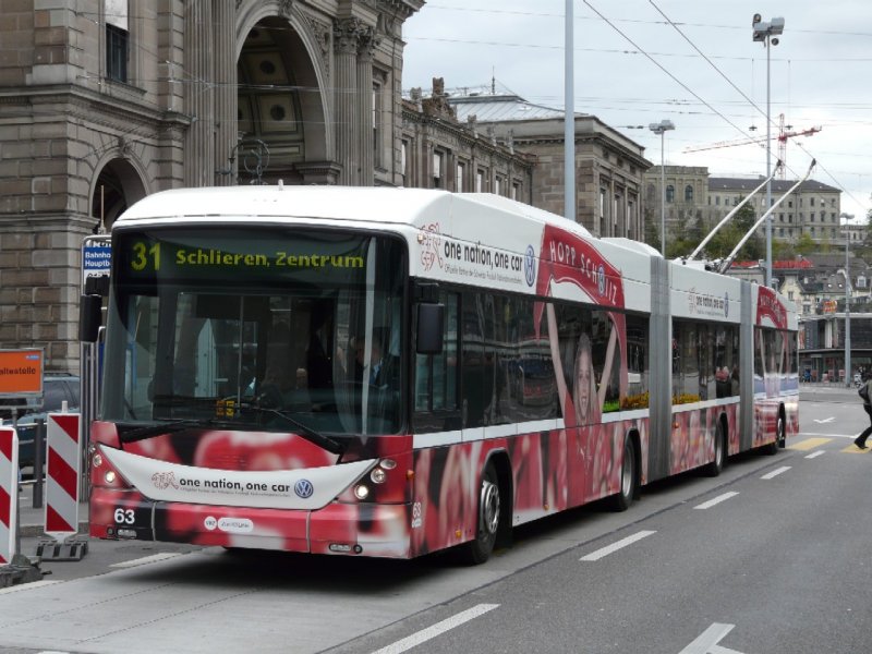 VBZ Zürich - 3 Teiliger Hess - Swisstrolley BGGT-N2C Nr.63 mit Werbung fur die EURO 08 unterwegs auf der Linie 31 am 19.04.2008
