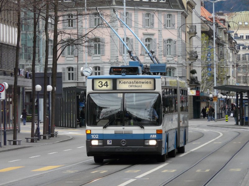 VBZ Zürich - Mercedes O 405 GTZ Trolleybus NR.102 unterwegs auf der Linie 34 am 19.04.2008