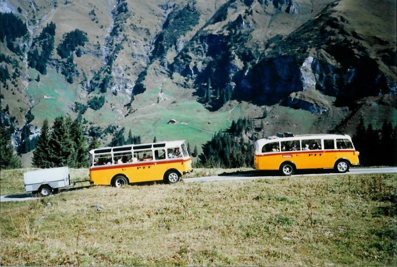 Stebler, Basel BS 1815 Saurer/FHS (ex P 24'143) + Streiff, Gelterkinden AG 306'557 Saurer/Gangloff (ex Krebs, Belpberg) am 27. September 2008 Kiental, Tschingel (Postautofahrt Griesalp-Bundalp)