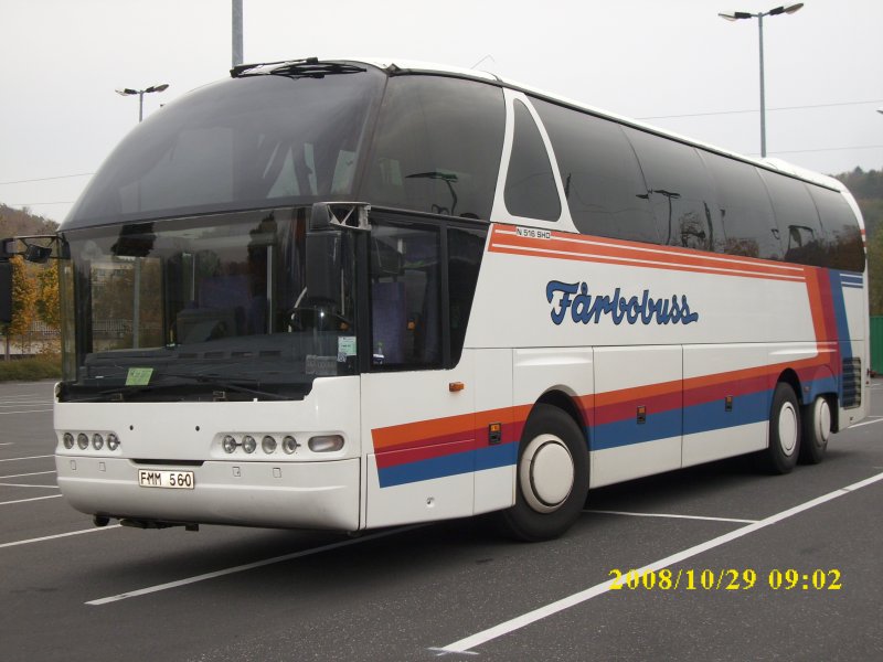 Schwedischer Neoplan-Reisebus am 29.10.2008 vor einem Supermarkt in Bergen/Rügen.