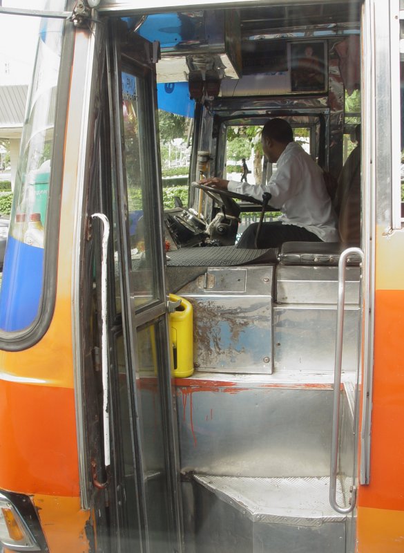 Am 07.07.2009 - Blick in einen Bus, der im kurzen Zwischenstadtverkehr in Thailand eingesetzt wird (ca. bis zu 50 km), ohne Klimaanlage und innen liegendem Frontmotor. Entsprechend eng mit hohen Stufen ist der Eingang für die Buspassagiere. Gesehen in der Provinzhauptstadt Buri Ram.