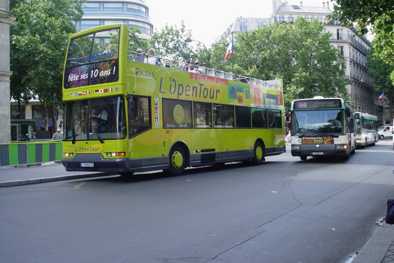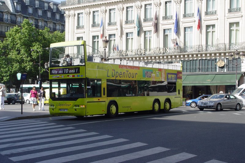 Am 14.07.2009 steht vor der Oper und dem Café de la Paix in Paris dieser gelbe Stadtrundfahrbus der Gesellschaft "L'open tour". Es handelt sich hierbei um eine VOLVO Sonderbauart.