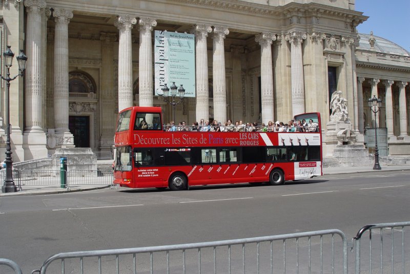 Am 15.07.2009 steht in Paris vor dem Grand Palais dieser rote offene Stadtrundfahrtbus der Gesellschaft "Les cars rouges". Es handelt sich um eine VOLVO Sonderbauart
