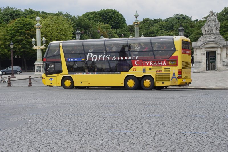Am 19.07.2009 hält dieser Stadtrundfahrtbus der Gesellschaft "Cityrama" auf der Place de la Concorde in Paris. Um was für einen Bustyp es sich handelt weiss ich leider nicht