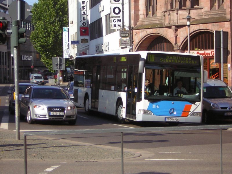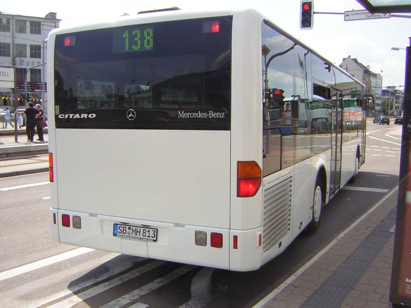 Dieser Bus ist gerade an der Haltestelle Hansahaus in Saarbrücken weg gefahren, und ist als Linie 105 auf dem Weg zum Echberg in Saarbrücken.