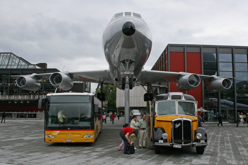 Ein nicht ganz alltäglicher Schnauzenvergleich: Mercedes-Benz O530G "Citaro" Nr. 8 der Eurobus Häfliger AG aus Sursee, die Coronado (Convair CV 990) ex Swissair und Saurer L 4 CT 2 D von Dillier aus Sarnen. Gesehen anlässlich der Eröffnung der neuen Strassenverkehrshalle im Verkehrshaus, 27.6.09