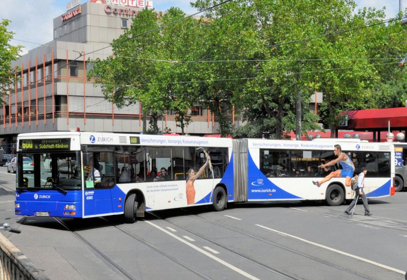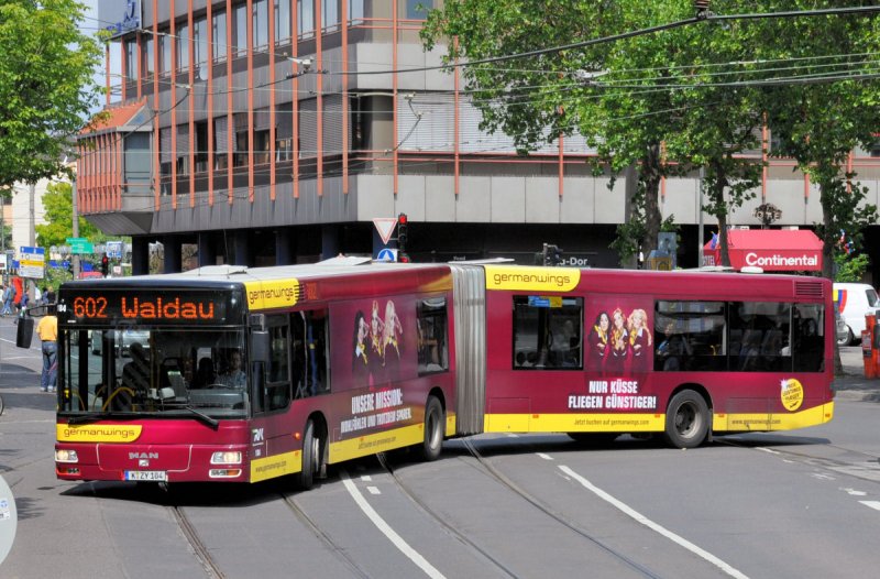 MAN Gelenkbus, Linie 602, RVK, mit markanter "Rainer Brand" - Werbung - Busbahnhof Bonn 08.07.2009
