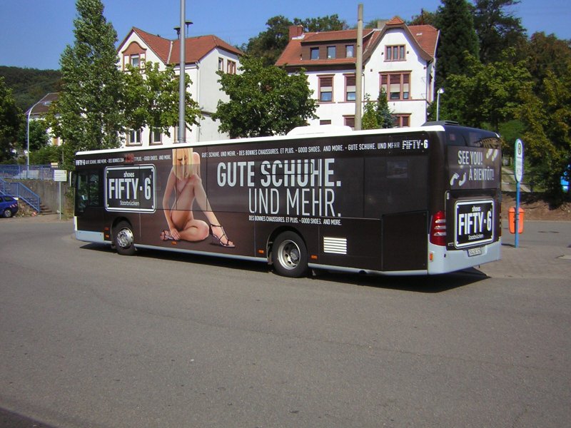 Ein mit Werbung gestalteter Citaro-Bus wartet auf seine Fahrt zur Haltestelle Römerkastell.