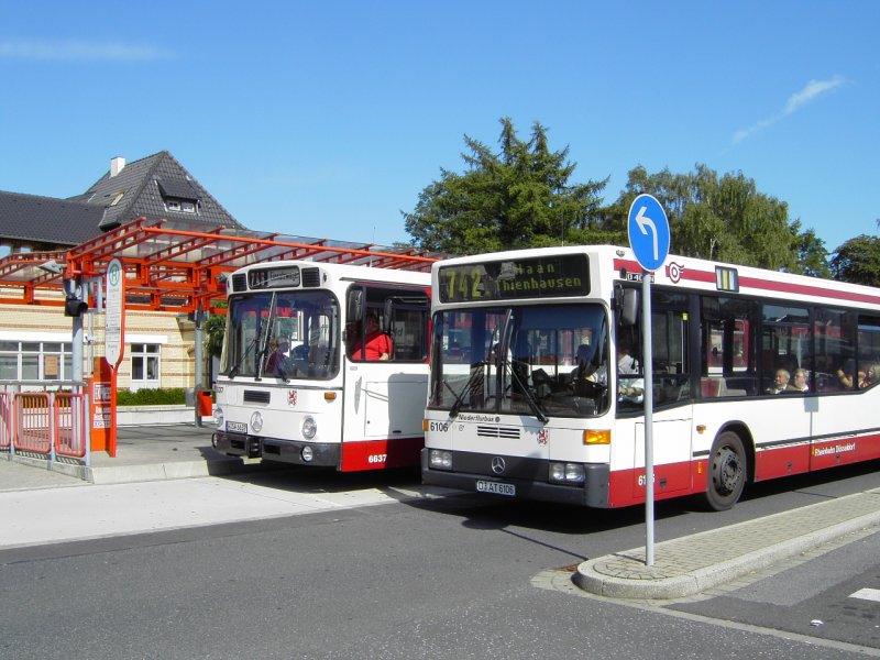 Im Vordergrund ein Mercedes O 405 N2, Baujahr 1994, Wagennummer 6106. Im Hintergrund ein Mercedes O 305, Baujahr 1985, Wagennummer 6637.