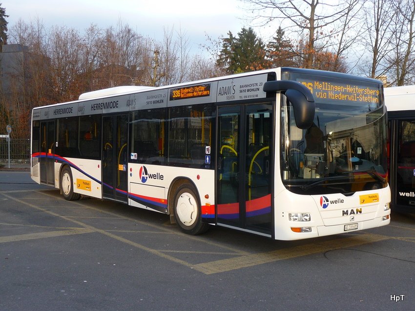 Postauto - MAN Lions`s City AG 208685 unterwegs auf der Linie 336 bei den Haltestellen neben dem Bahnhof Wohlen/AG am 05.12.2009