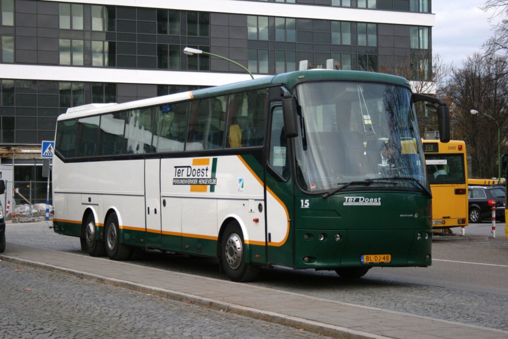 2 Holländische Volvo B12B Reisebusse auf dem Busparkplatz für die Besucher des Aachener Weihnachtsmarkts.