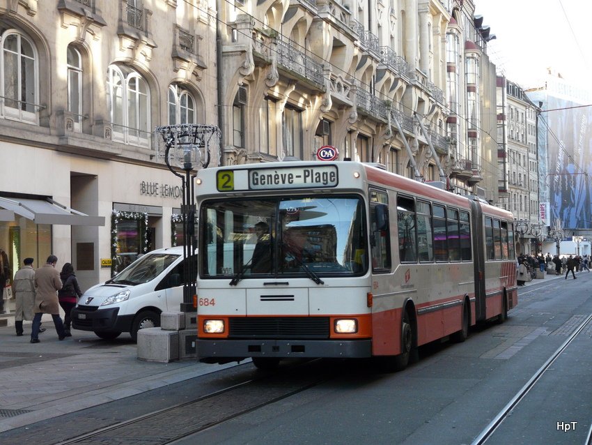 TPG - NAW-Hess-Siemens BGT 5-25 Nr.684 unterwegs auf der Linie 2 in der Stadt Genf am 11.12.2009