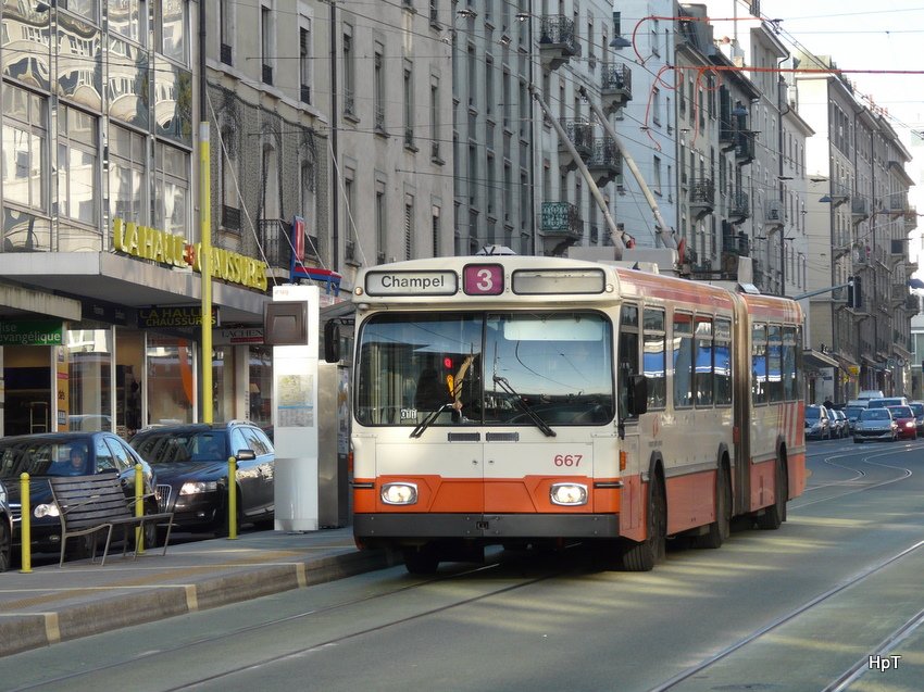 TPG - Saurer-Hess GT 560 Nr.667 unterwegs auf der Linie 3 in der Stadt Genf bei der Haltestelle Lyon am 11.12.2009