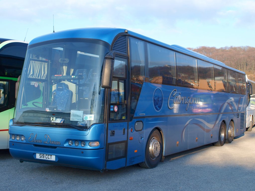 Englischer Neoplan Euroliner auf dem Busparkplatz für die Besucher des Aachener Weihnachtsmarkts.