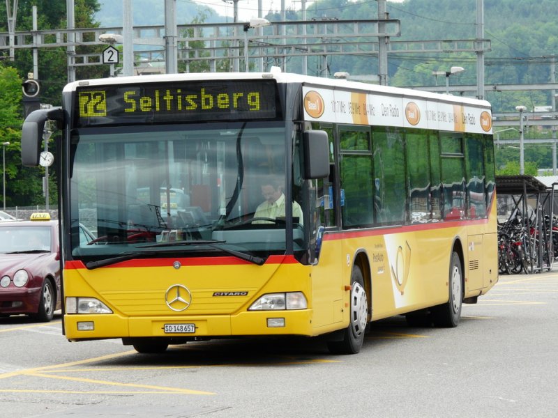 Postauto - Mercedes Citaro SO 148658 unterwegs auf der 83 bei der Haltestelle neben dem Bahnhof in Prattelen am 11.05.2009