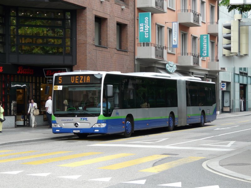 TPL - Mercedes Citaro Gelenkbus Nr.411 TI 139643 unterwegs auf der Linie 5 in der Stadt Lugano am 13.05.2009