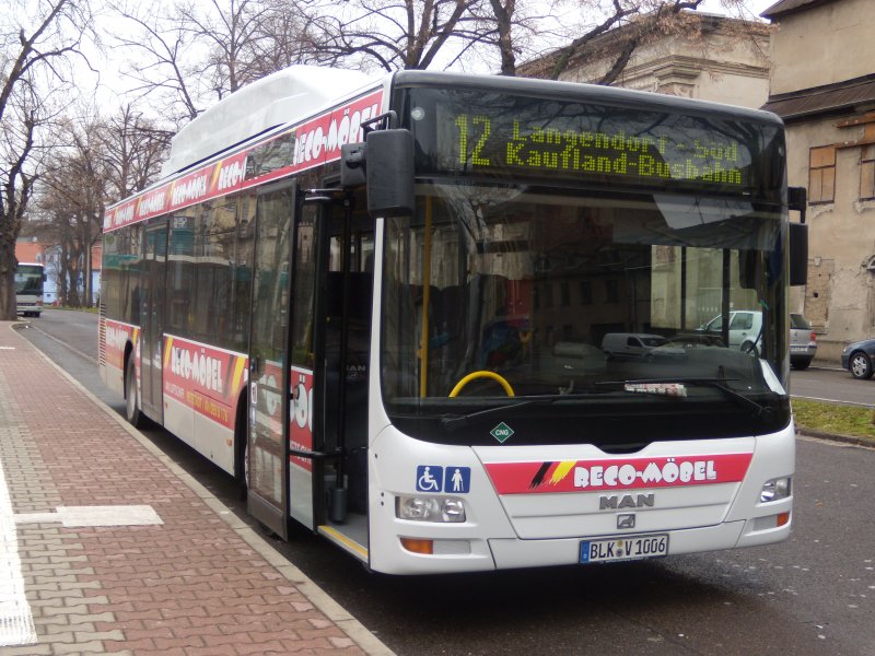 BLK-V1006, ein Lion´s City Ü CNG, steht auf Pausenstellung nachdem er gerade aus Richtung Wiedebach auf der Stadtbus-Linie 12 gekommen ist. Aufgenommen am 23.03.2009 auf dem Busbahnhof in Weißenfels.