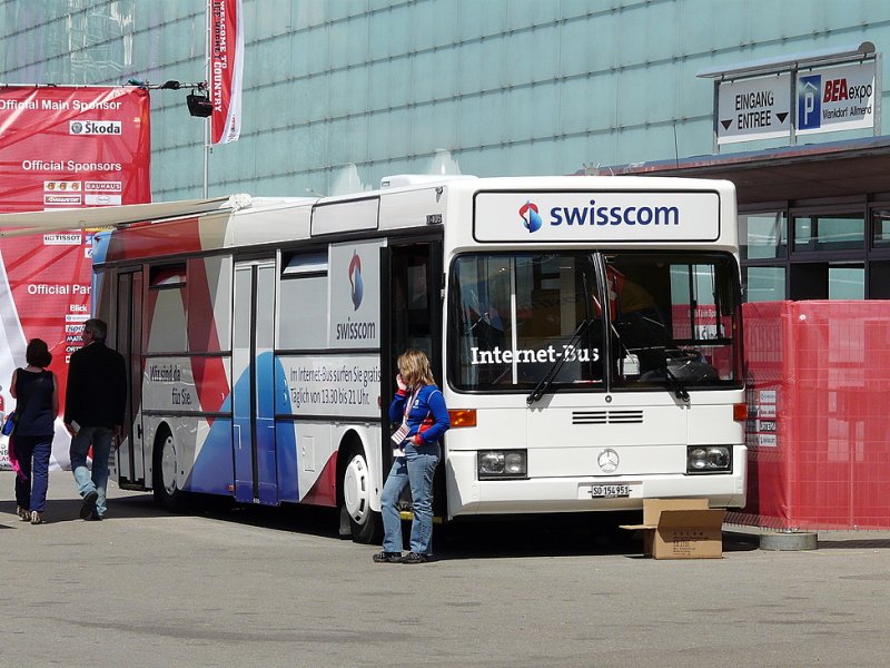 Swisscom - Mercedes O 405 SO 154951 als Werbebus auf dem Areal des Eisstadion während der Eishockey WM 2009 in Bern am 03.05.2009