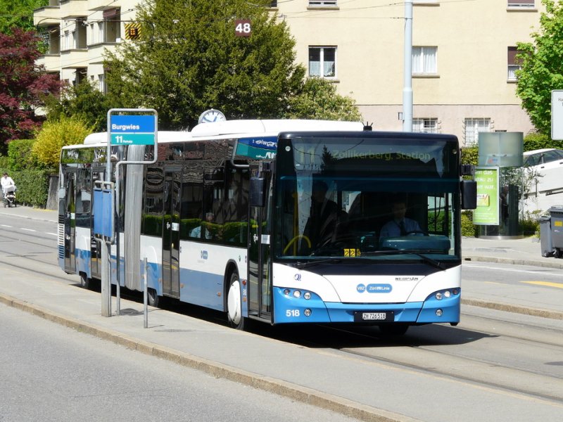 VBZ - Neoplan Gelenkbus Nr.518 ZH 726518 unterwegs als Tramersatz bei der Haltestelle Burgwies am 26.04.2009
