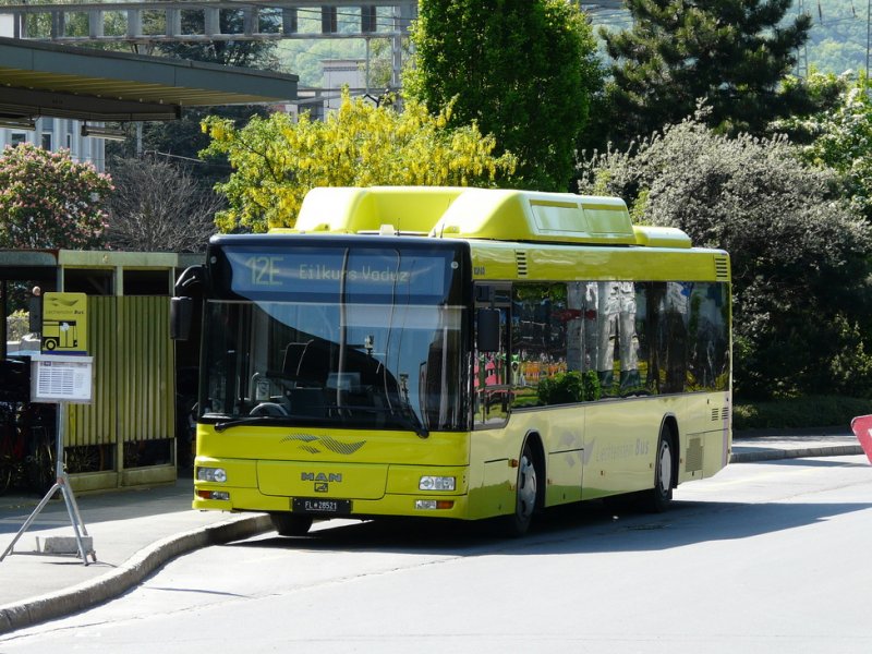 Lichtenstein Bus -MAN Lion`s City FL 28525 bei der Haltestelle neben dem Bahnhof von Sargans am