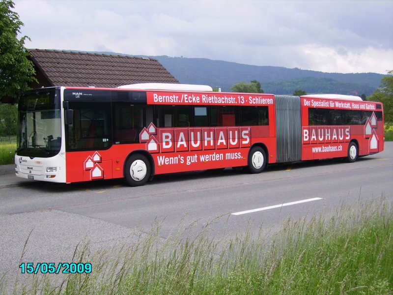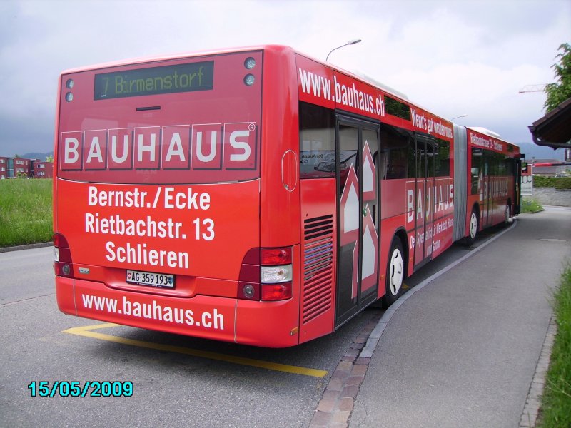 PU Wicki, Zufikon, AG 438'038 (MAN Lion's City GL/A23, 2009) am 20.5.2009 in Bremgarten, Post. Die drei Fahrzeuge dieses Typs wurden für die neuen Schnellbuslinien durch den Uetlibergtunnel nach Zürich im Mai 2009 beschafft.