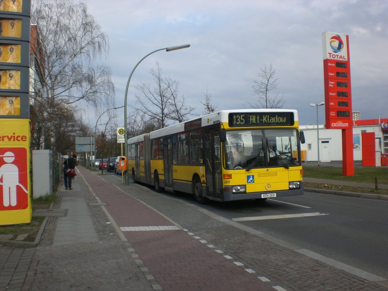 Mercedes-Benz O 405 N (Niederflur-Stadtversion) auf der Linie 135 nach Alt-Kladow an der Haltestelle Spandau Heerstraße/Wilhemstraße.