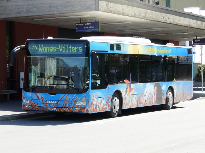 Sarganserland Werdenberg - MAN Lion`s City Bus SG 297513 mit Werbung bei der Haltestelle neben dem Bahnhof von Sargans am 07.05.2009