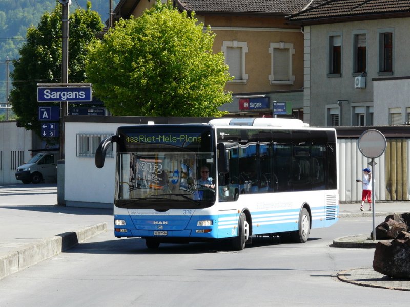 Sarganserland Werdenberg - MAN Lion`s City Bus Nr.314 SG 297506 unterwegs auf der Linie 433 neben dem Bahnhof von Sargans am 07.05.2009