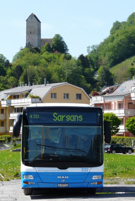 Sarganserland Werdenberg - MAN Lion`s City Bus Nr.332 SG 297512 auf dem Autoparkplatz abgestellt neben dem Bahnhof von Sargans am 07.05.2009