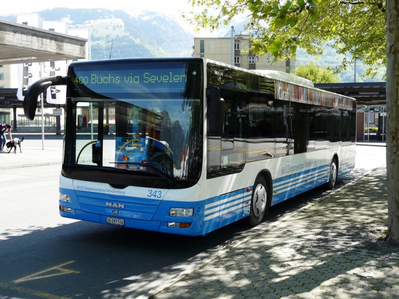 Sarganserland Werdenberg - MAN Lion`s City Bus Nr.343 SG 297516 bei der Haltestelle neben dem Bahnhof von Sargans am 07.05.2009