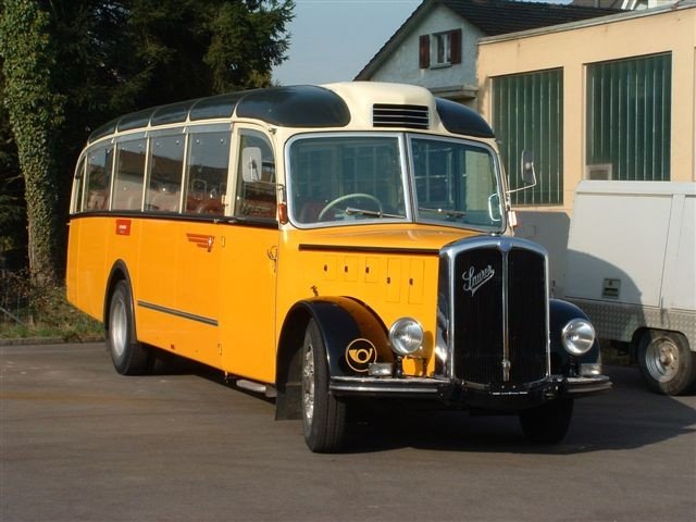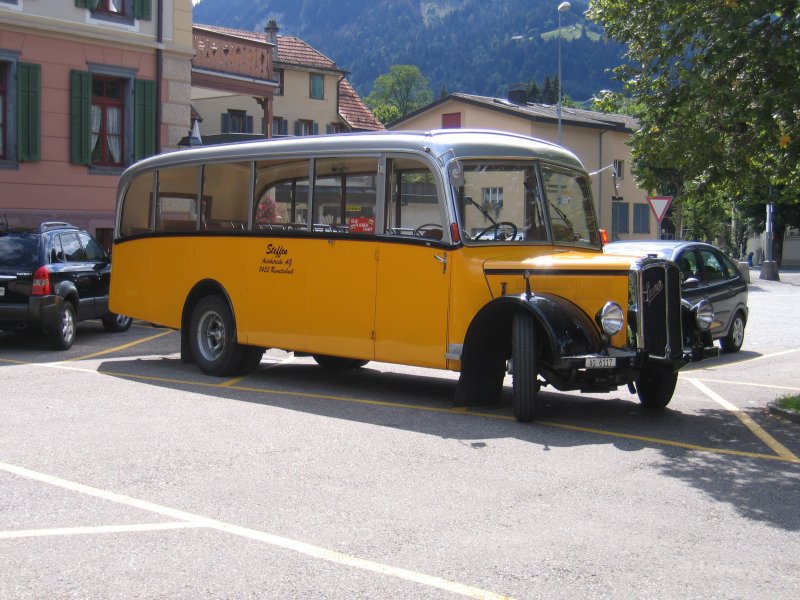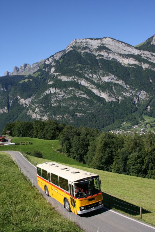 Saurer/Tüscher RH525-23, 1981, SG 87'147 von PU Schett, Sargans, am 15.7.2007 zwischen Mels und Vermol. Das mit Abstand älteste Fahrzeug der Sarganserländer Postauto-Flotte wurde nach dem Ende der Postauto-Ära an einen Privaten verkauft.