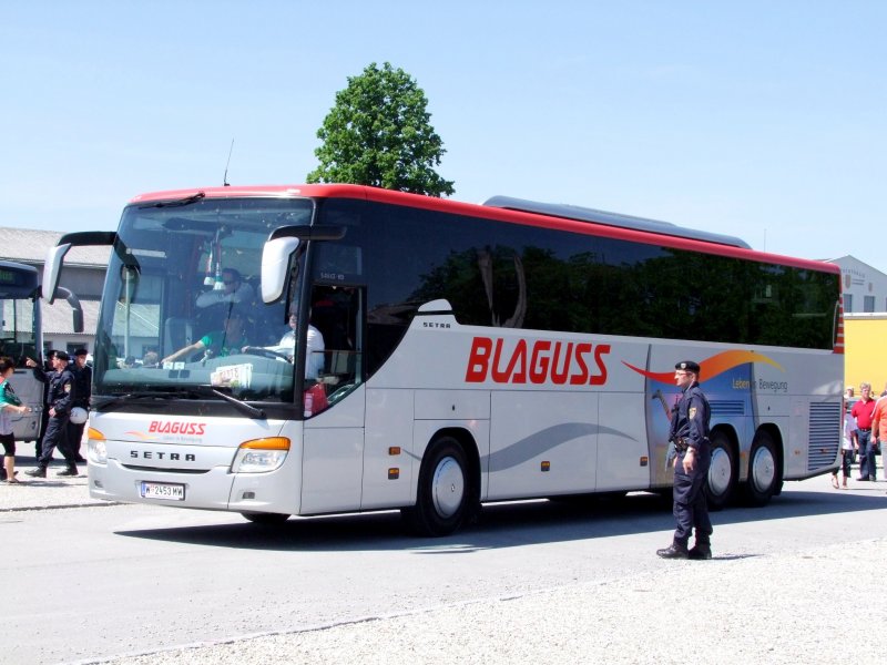 SETRA-S416GT-HD der Fa. Blaguss karrt Rapid-Fußballfans zum Bundesligaspiel nach Ried i.I. und muß den Polizeilichen Anweisungen folgen; 090517