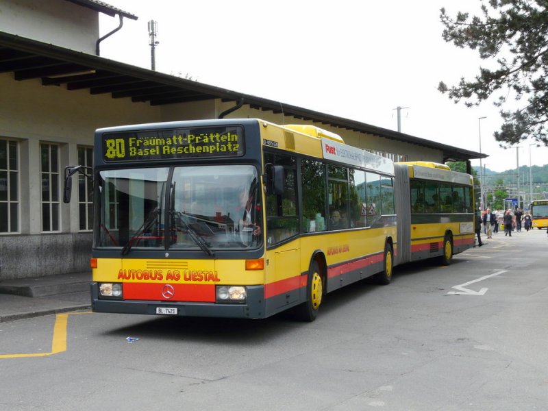 AAGL - Mercedes O 405 GN Nr.91 BL 7421 unterwegs auf der Linie 80 bei der Haltestelle vor dem Bahnhof in Liestal am 11.05.2009