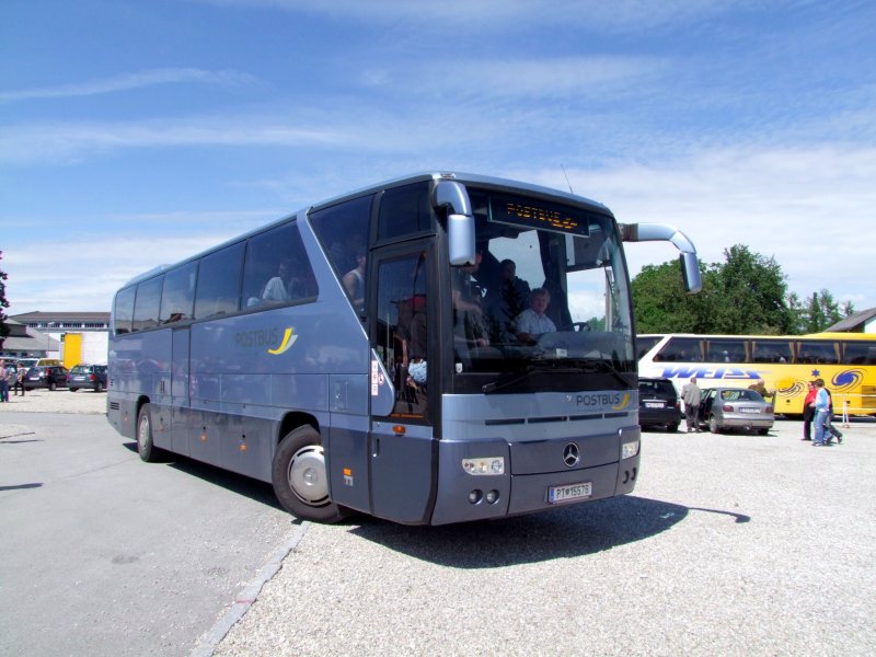MERCEDES-POSTBUS(PT15576) erreicht mit Steirischen FußballSchlachtenbummlern den Parkplatz vorm FILL-Metallbaustadon in Ried i.I.; 090531