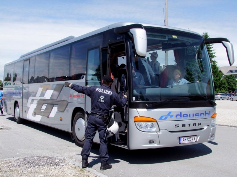 SETRA_S416GT der Fa.Deuschl ist mit Fußballfan´s vorm FILL-Metallbaustadion in Ried eingetroffen, und wird sogleich Polizeilich zugewiesen; 090531