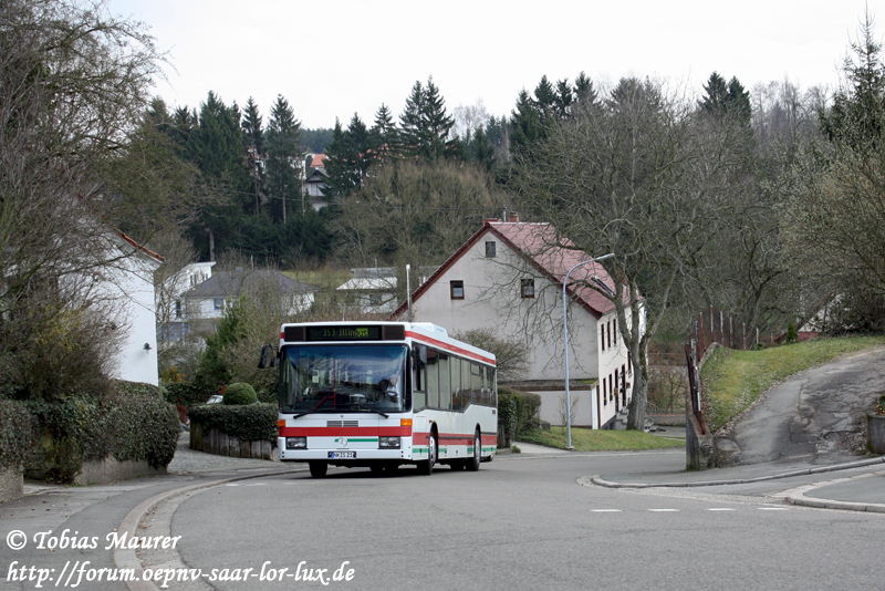 30.03.2009: Der NK-S 21 erklimmt den aufstieg aus dem Leopoldsthal in Schiffweiler. Der O 405 NÜ gehört zum Fuhrpark der GRS Verkehrsdienste und wird im Auftrag der RSW auf der Linie 353 nach Illingen eingesetzt. Der Wagen stammt im übrigen von der RSW und wurde als Reservefahrzeug beschafft.