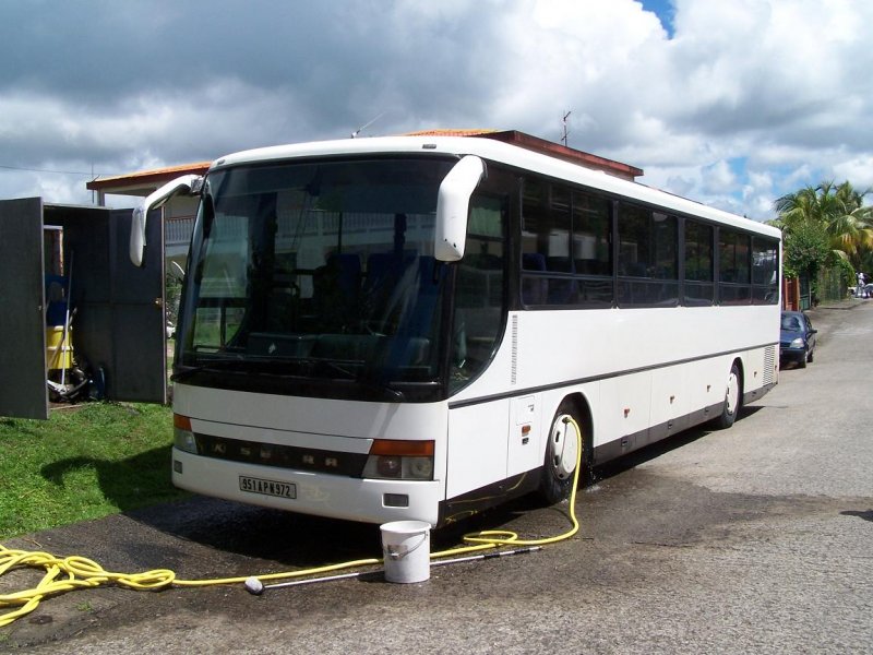 Ein nagelneuer Setra Reisebus, gerade frisch aus Deutschland importiert, wird gleich vom Schmutz der Überführungsfahrt befreit. Gesehen am 06.08.2009 in Evje.